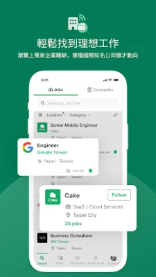 透過 Cake Meet 功能,您能輕鬆拓展個人職場人脈,與志同道合的業界夥伴、企業招募者、資深主管、專業領域專家及獵頭顧問建立有價值的連結。獨特的 AI 破冰技術,讓初次交流也能自然流暢,助您輕鬆開啟話題。此外,Cake 平台彙集了數萬筆來自知名外商、上市櫃公司及創新創業團隊的多元職缺,職位資訊公開透明,包括薪資範圍、職務更新時間及公司團隊成員,讓您全面掌握每一個潛力機會。