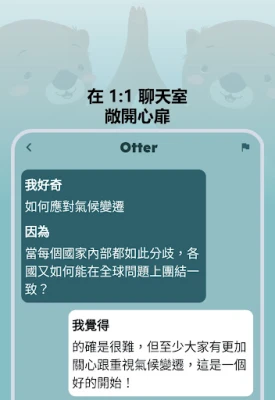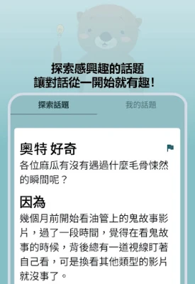 「好奇海獺」的核心理念是透過有意義的對話來豐富您的社交體驗。我們鼓勵您探索內心真正關心的話題,並在私密的 1:1 聊天室中,與志同道合的「獺友」們自由分享故事與見解。這裡的每一場對話,都從一開始就充滿深度與趣味,讓您輕鬆找到能傾訴心聲的筆友、激發思維的辯論夥伴,或是單純享受高品質對談的知己,共同探索世界的多元視角。